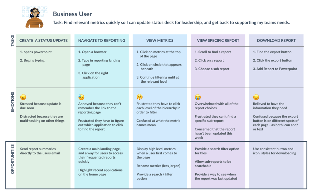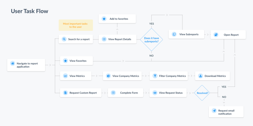 To get started, I conducted introductory interviews and a task analysis to understand the user’s pain points and how they used the reporting applications.