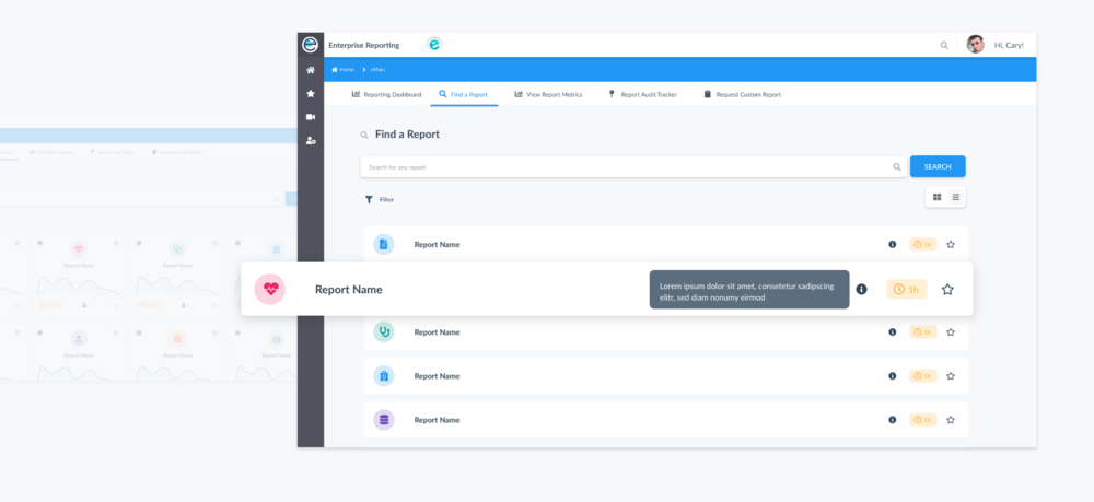 Users are able to search all reports, and navigate to nested reports when applicable. For easy scanning, a toggle switch is available that changes the view from a grid to a list.